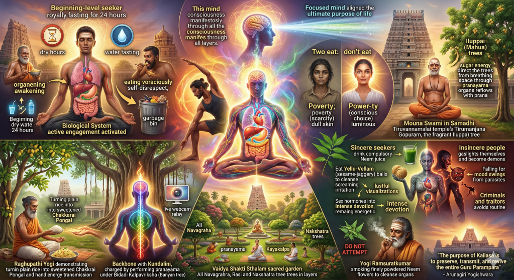 I sincerely recommend to all my devotees and disciples: come and study the Tiruvannamalai Ashram’s Vaidya Shakti Sthalam and replicate it in your own aadheenams — in Rajapalayam, Madurai, everywhere. In Madurai we have a large property in Tirupparankundram where we can create this. In Bidadi, the entire 100 acres can incorporate it. In Ichapuram Palace we have many acres — the whole area is called Kailasagiri. Hyderabad Aadheenam spans many acres. Salem Aadheenam, Erode Aadheenam — all are expansive spaces. Replicate this Vaidya Shakti Sthalam and perform pranayama there daily. Even in apartment settings, you can plant the necessary trees in large andas (pots) and place them on the terrace, as is done in the Shyamala Peetha Sarvajnapeetham. All the cosmic energies needed for kayakalpa are present in the Vaidya Shakti Sthalam. Long before, we established this in Tiruvannamalai, and today it has grown into a magnificent, thriving garden. We can replicate this kayakalpa infrastructure across all our aadheenams — Rajapalayam, Kashi, Madurai, Salem, Seeragapadi, Arani, Navalukuttapaatu, Tiruchengode, Adi Kailash-Bidadi, Hyderabad, Ichapuram Palace. In Kashi we have a significant property on the banks of the Ganga. Anyone who performs pranayama in the Vaidya Shakti Sthalam will find their entire physical, mental, prana, breathing, cognitive, and conscious structure empowered for a long and healthy life.