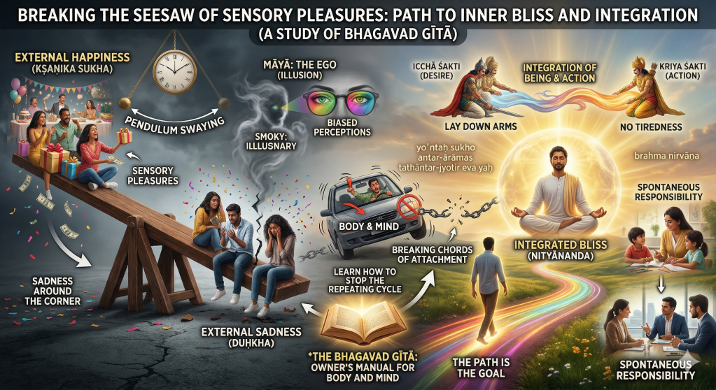 Kṛṣṇa says that sensory pleasures are bound to end; they do not last forever. Generally, we are controlled by what happens outside us. Our happiness is an emotion that is created by something outside of us—a pleasant situation, the presence of someone we like, and so on. When we experience happiness due to some event outside us, be very sure, sadness is around the corner. When we experience the joy in us because of an external source, we will experience sadness once that external source is taken away from us. We always attach our happiness to something that is external to us. If these things are taken away from us, we are left with sadness. It is like a pendulum swaying from one extreme of happiness to the other extreme of sadness.