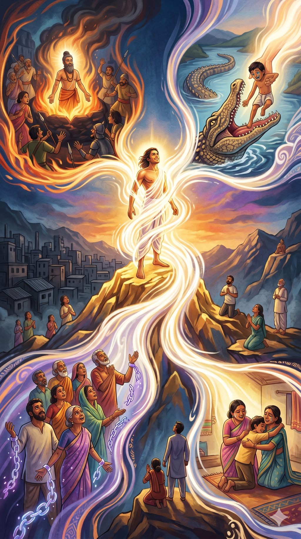 …do not leave. Come in. Your body itself is Madurai. In your Dwadasantha, our Lord is seated even now, and Lord Sundareshwara is continuously performing His divine plays even now. That is your life. From whatever angle you approach the Supreme Being within you, from that angle He manifests. Dharumi approached with the self-doubt “Not for me, not for me, not for me, He won’t come for me.” And He shows Nakkeeran precisely as the reflection, the mirror of that self-doubt. “Hey! Stop! If a flawed poem…